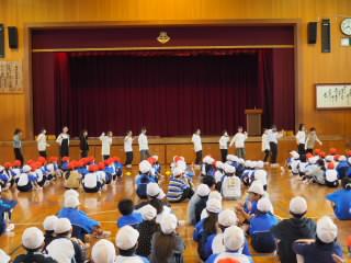 お出迎えのために玄関で待っていた実行委員の5年生たちは、園児たちの姿が見えると飛び上がって喜んでいました。