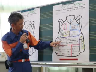 6年生が考えた「非常持ち出し袋」の中身をチェックしていただきました。