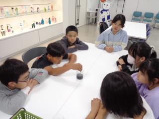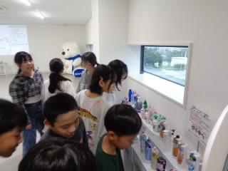 見学の後、油の入った水に洗剤を入れて、洗剤の効果を確かめる実験しました。