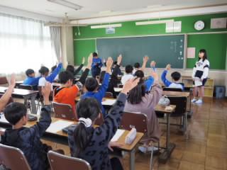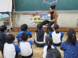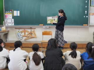 楽しみにしている「おはなし広場」の日です。3年生の学級では、絵本の読み聞かせの前に「おはようございます」「こんにちは」「もみじ」など手話を教えていただきました。