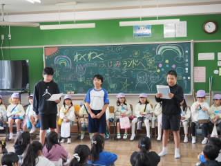 次は「3年生」です。これまでの総合的な学習で調べた「富士見校区のじまん」を発表しました。校区の人、店、公園、モアイ像、そしてりんご皮むき大会のことを模造紙にまとめ、台本も考え、自信をもって発表できました。