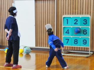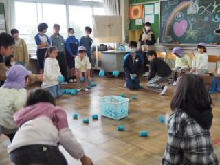はじめの遊びは「玉入れ」です。教室の中心に置いたかごに玉を投げ入れていきます。30秒で40個も入ったグループもあり、グループ対抗戦の「玉入れ」はとても盛り上がりました。