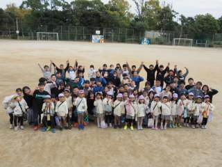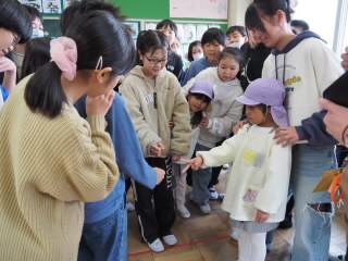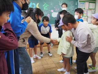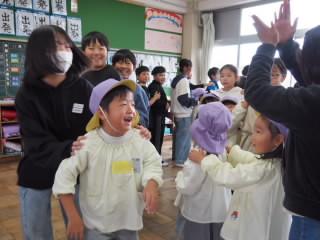 次の遊びは、「じゃんけん列車」です。園児の背の高さに合わせてしゃがんで歩く5年生もいます。音楽が止まると相手を見つけてじゃんけんをします。じゃんけんに勝った子は大喜びでした。
