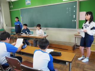 今日の議題は給食委員からの提案です。給食委員長が「給食クイズ」について話をしました。