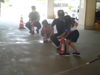 外に出て、水消火器を使って、消火器の使い方を学びました。