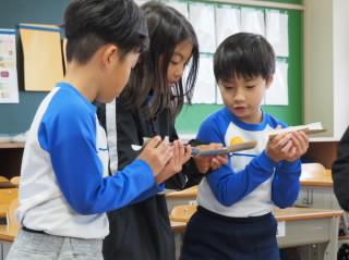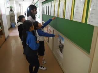 職員室前の「仲よし班」掲示板を確かめに来ている子がいました。この日は、昼休みに「仲よしタイム」がある日です。
