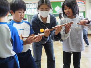 このゲームは、一人2つずつトイレットペーパーの芯を半分に切ったもの持ち、それをつなげてパイプラインを作り、ピンポン玉をゴールのバケツまで転がしていく競争です。6年生が声を出して、しっかりとチームをまとめています。さすがです。