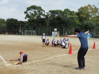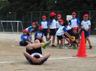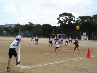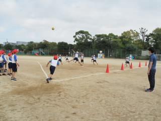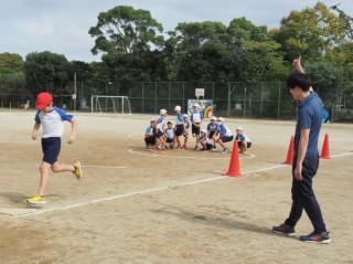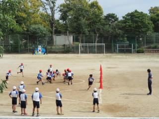 運動場から元気のよい声が聞こえてきました。4年生がキックベースをしていました。ボールを取って全員が円の中に集まるのが早いか、ボールをけった子がカラーコーンを回ってホームベースに戻るのが早いか、大盛り上がりでゲームをしていました。