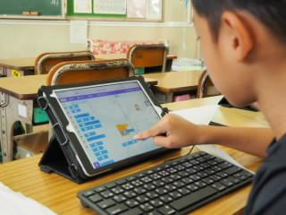 コンピュータクラブの教室に行くと、思い思いにタブレットを操作して楽しんでいました。この子は、「スクラッチ」というアプリでプログラミングをしていました。