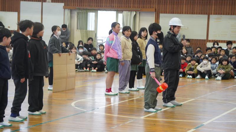 訓練のあと、安全生活課の方のお話を聞き、校外でこわい人やあやしい人に出会った時、どうすればよいかという内容のDVDを見ました。(低学年の子にとっては、ちょっと怖かったかもしれませんね)