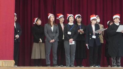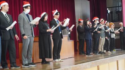 終業式の後、サプライズで先生たちがクリスマスソングのハンドベルと歌をプレゼント。