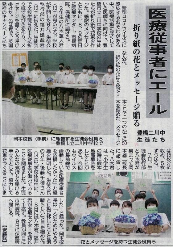 愛知県での新型コロナウイルス感染者が、今までで最多の53人となりました。豊橋市内でも1名の感染者が報告されています。今日から「GO TO トラベル」キャンペーンが実施されますが、明日から4連休も始まります。関東圏や関西圏だけでなく愛知県内でも感染拡大地域に出かけないようにするとともに、人が密集するところでのマスクの着用、手洗いの実施など気をつけましょう。新型コロナウイルスに感染して「GO TO トラブル」となっては意味がありません。今日は「大暑」です。全国各地で猛暑日を記録するところが増えています。熱中症にも気をつけましょう。