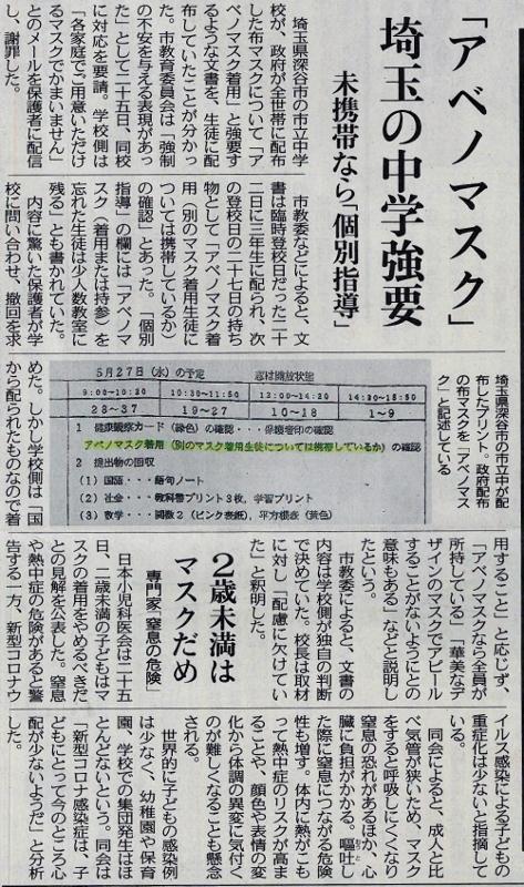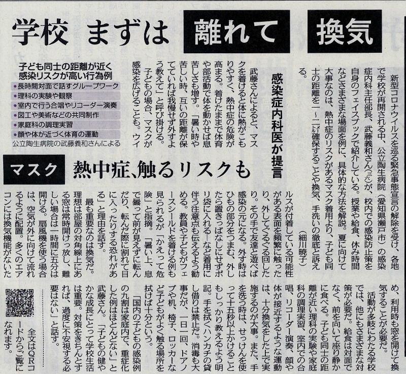 学び続ける 投稿日時 : 2020/06/07 主担 カテゴリ:今日の出来事 (令和2年6月6日 朝日新聞より) 明日から、二川中学校では7時間授業を始めます。授業時間が不足するので慌ててはしょるのではなく、授業時間数を増やしてじっくりと学びたいと考えています。同じ教科が1日に2時間あるということも出てきます。生徒のみなさんも、忘れ物などしないように気をつけてください。そして、最も大切なことですが、最近暑くなってきましたので、早めに寝るなど体調も整えましょう。朝ご飯を抜いたり寝不足だったりすると、熱中症にかかる危険性が高まります。 {{options.likeCount}} {{options.likeCount}}