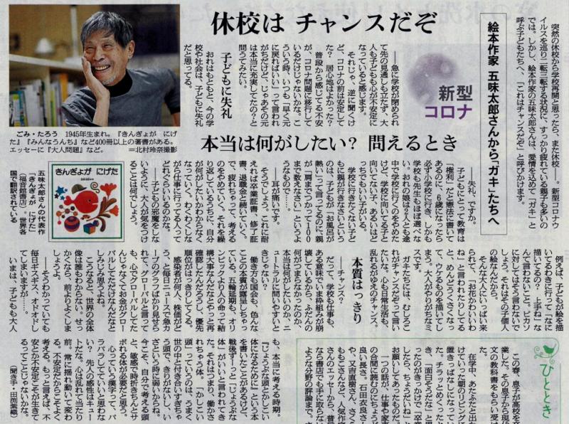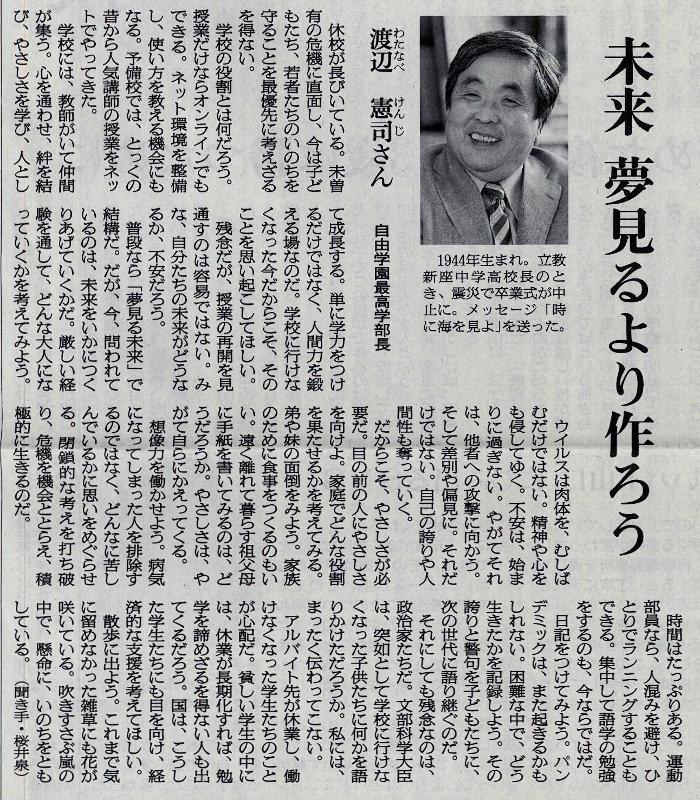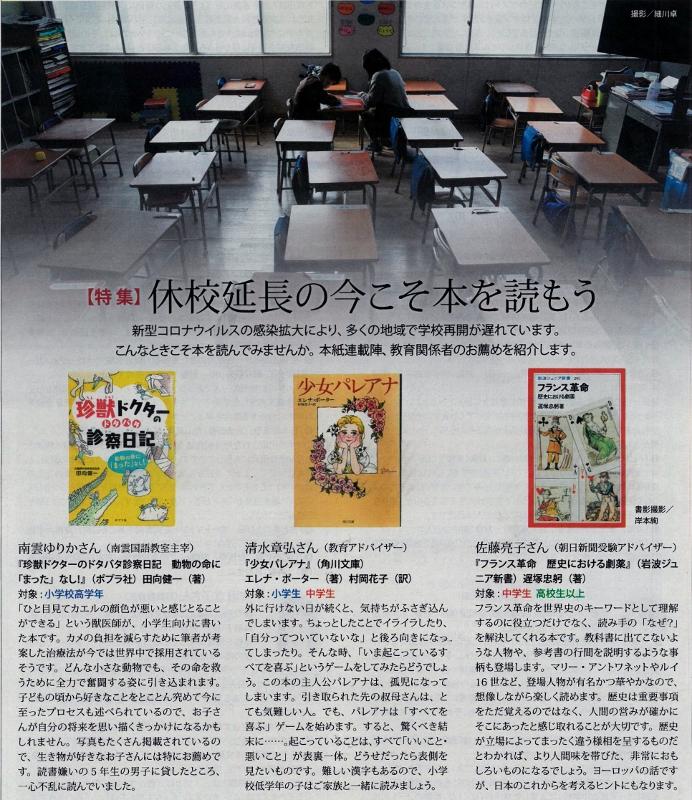 学校で渡しているプリントや、教科の課題、英語の歌を歌う、学習動画を見るなど、学びは進めていますか。先週、二川中学校の卒業生に、道端で久しぶりに会い、少しだけ会話をしました。高校でも課題が出ているけれど、ちゃんとやっていて、すぐに終わってしまうこと。友達とはスマホで会話はしているけれど、全然会っていないこと。運動不足解消のために、近所を散歩していることなどを聞きました。なかなかやることがないと悩んでいる様子でした。みなさんも同じような状況だと思います。突然生まれたこの特別の有意義な時間を、ぜひ読書の時間として使いましょう。昔読んだ本を読み返したり、ネットの本屋さんで注文できたり、デジタル書籍で読めますので、読書に挑戦してみましょう。