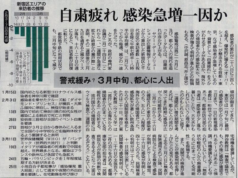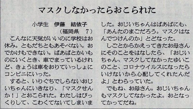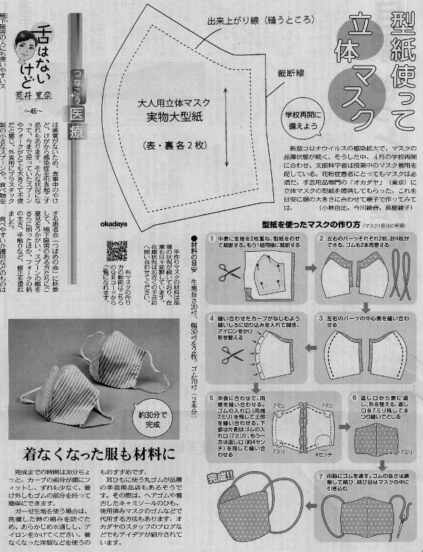 マスクは不足していませんか。薬局でも朝早く並べる人しか買えないということで、販売を不定期にするところも出てきました。新聞にマスクの作り方が出ていましたので、自分で作ってみましょう。「めんどくさい」とよく言ってしまいがちですが、新型コロナウイルスに感染して苦しまないためにも、自分の時間を少しだけでも使ってみましょう。手をけがしていたり、家に適切な布がなかったりして作れない場合には、安倍総理も着用している布マスクが、4月中旬から配付され始めるそうです。学校再開までには間に合うかもしれません。
