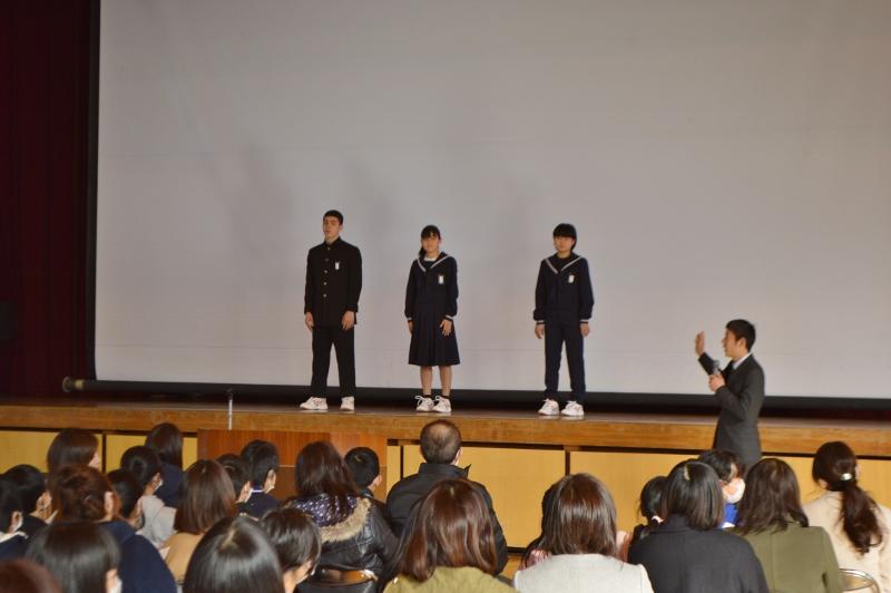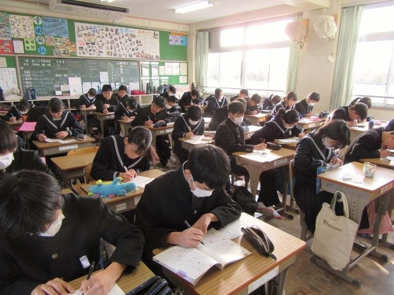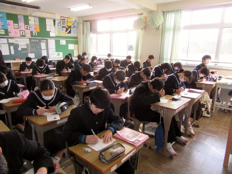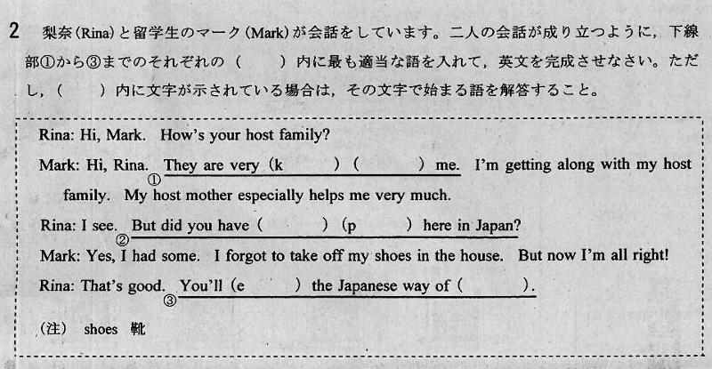 昨日、愛知県の公立高校の学力検査がありました。今朝の新聞に問題が掲載されていましたが見ましたか。入試問題は、3年生にならないと解けないわけではありません。また、3年生になったからといっても、1年生からしっかり勉強しなければ解けません。設問1は、グラフを見て解く問題で、2年生にならないと解けません。そこで、設問2の「部分英作文」を掲載しました。①は「彼らは私にとても親切です。」という意味です。「親切な」という単語は習っていませんが、わかる人もいるでしょう。②は「でも、この日本でいくつかの問題はありませんでしたか。」で、「問題」という単語も1年生で習っていませんが、疑問文で使う「いくつかの」は習ったのでわかるかな。③は「あなたは、日本の生活様式を楽しむでしょう。」は、未来形の部分はひとまず置いておいて、Unit11「思い出の一年」でやったばかりで、「楽しむ」「生活」はできますよ。インターネットで他の問題も見ることもできますし、興味ある人は他教科などもチェックしてみましょう。このような英作文を解くには、基本文を覚えることが大切です。教科書の150頁と151頁にある基本文を、音読したり、書いたりすると力がつくので取り組んでみてください。