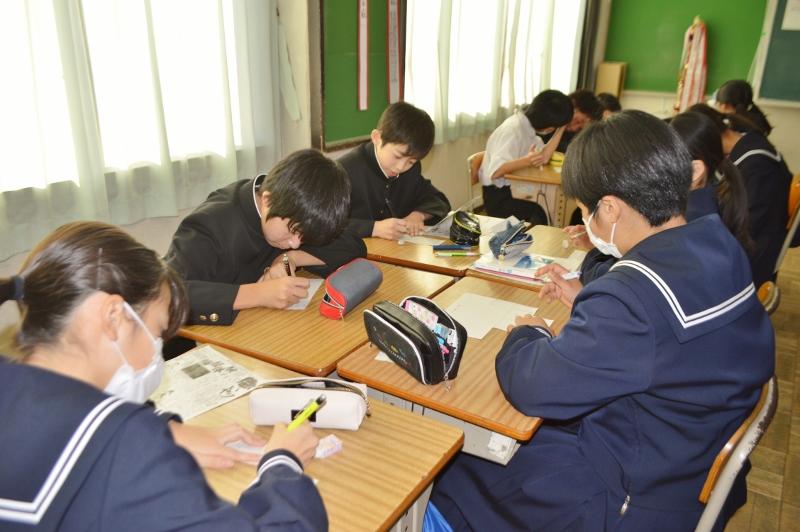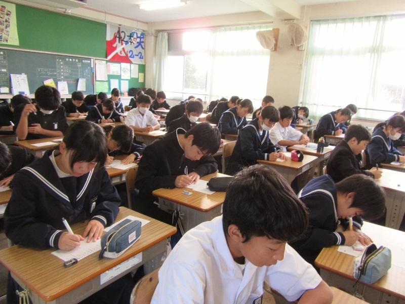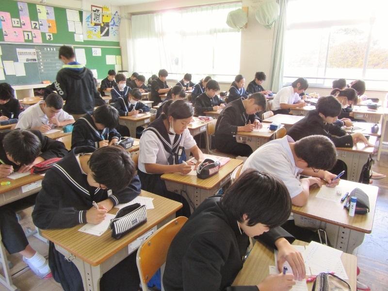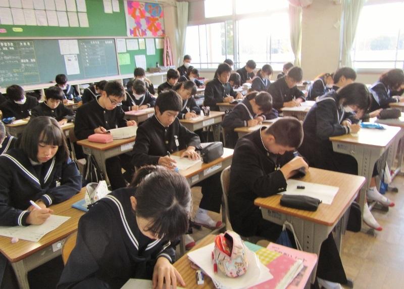 英語スペリングコンテスト 投稿日時 : 2019/12/13 主担 カテゴリ:今日の出来事 6時間目、3年生は、英語スペリングコンテストに取り組んでいました。放送を聞いて、英単語や英文を書き取ります。集中力を乱さないために、廊下からそっと写真を撮りました。 {{options.likeCount}} {{options.likeCount}}