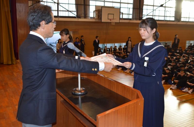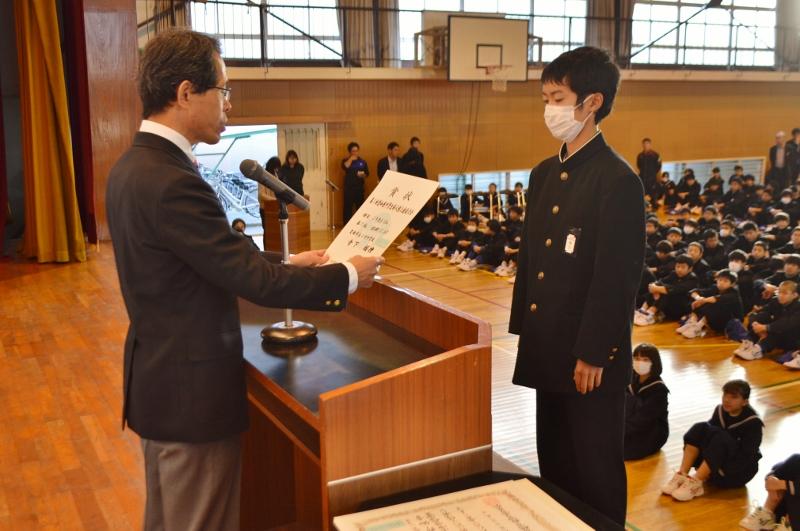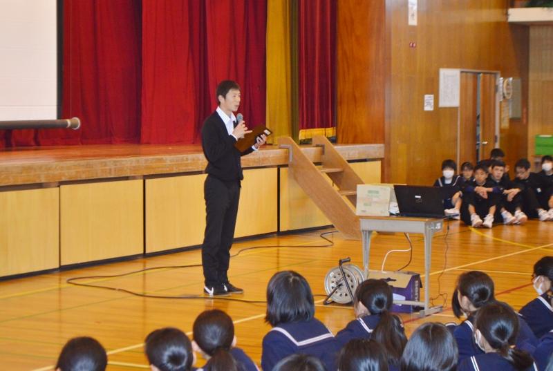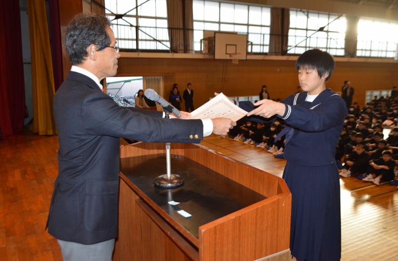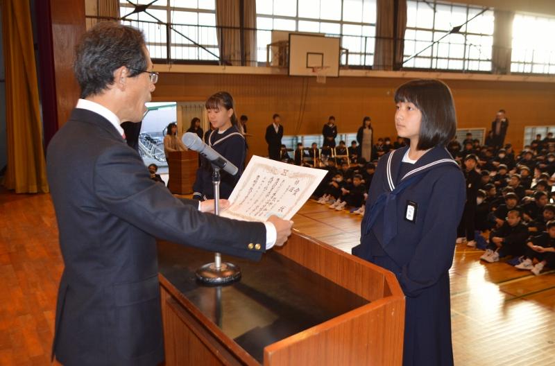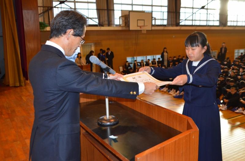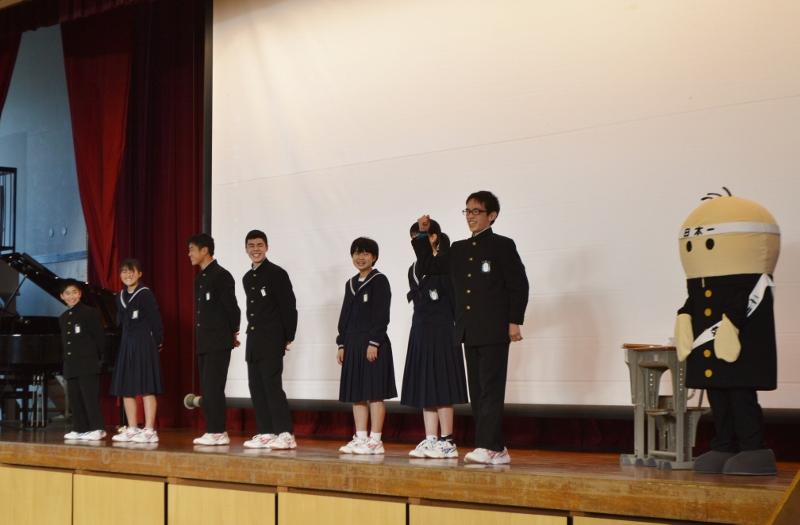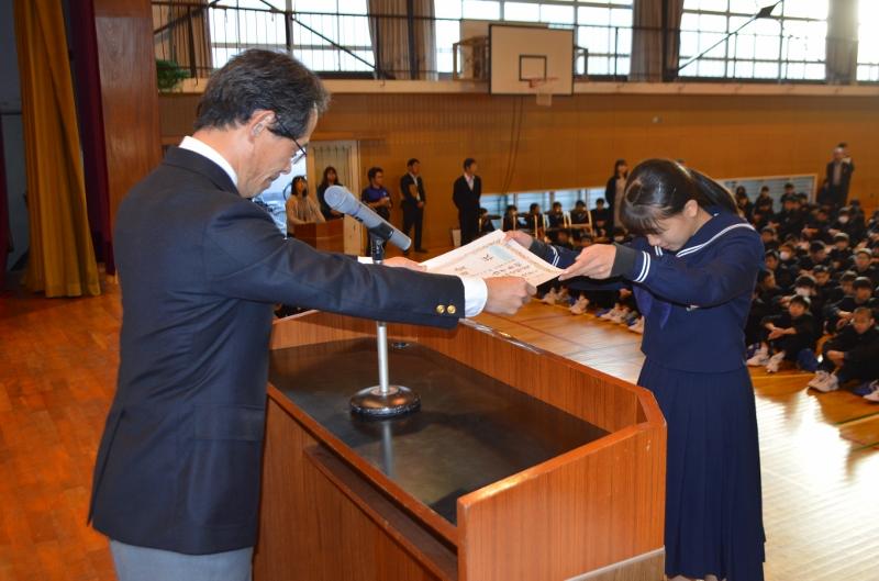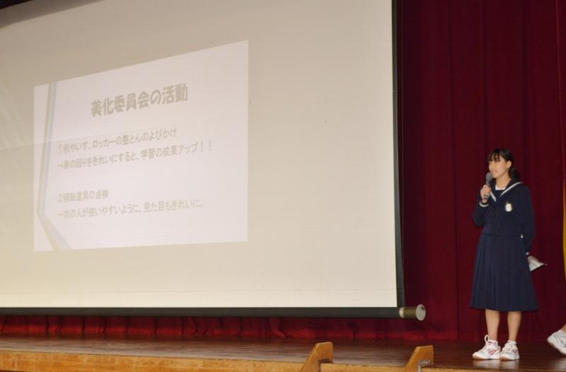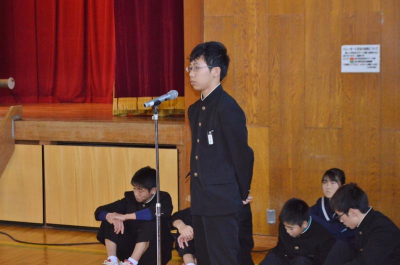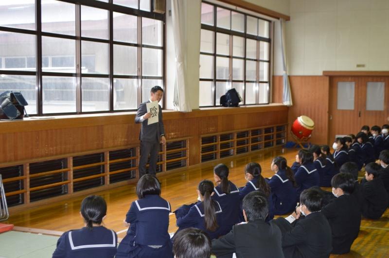 FS集会を行いました! 投稿日時 : 2019/12/03 主担 カテゴリ:今日の出来事 今日の7時間目、FS集会を行いました。会の初めに、表彰を行いました。陸上競技大会、競書大会、実践体験文とポスターの表彰を行いました。生徒会からは、10分間配膳について、美化委員会からは「心を磨く掃除」の啓発に向けての発表がありました。そして、今回から2年生の指揮と伴奏によって校歌を歌いました。最後に、生徒指導主事より、校則改正の話があり、来年度より女子のスラックスの導入。そして、明日から白色のソックスの他に、黒色と紺色の追加の連絡がありました。これからも前向きに校則について考えていきたいと考えています。ブラックな校則があったら相談してください。 {{options.likeCount}} {{options.likeCount}}