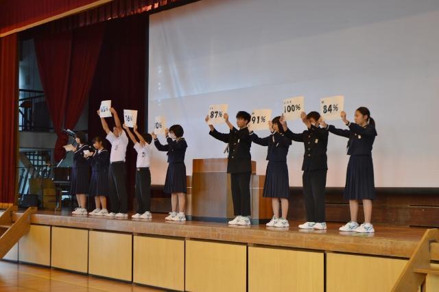 全校集会を行いました 投稿日時 : 2018/12/21 主担 カテゴリ:今日の出来事 3時間目、冬休み前の全校集会を行いました。ハンドボール部の東三大会優勝をはじめ、女子バレーボール部の県大会3位などの部活動の表彰や、英語スピーチコンテスト、書道や感想文、絵画コンクールなどの文化的な表彰もたくさん披露されました。また、校長先生からは2学期のがんばりやこれから期待すること、生徒指導主事からは冬休み前の過ごし方などについての話がありました。また、今回から、指揮と伴奏が2年生の代表生徒に代わり、全員で校歌を歌いました。 {{options.likeCount}} {{options.likeCount}}