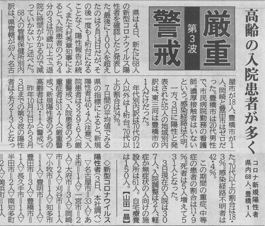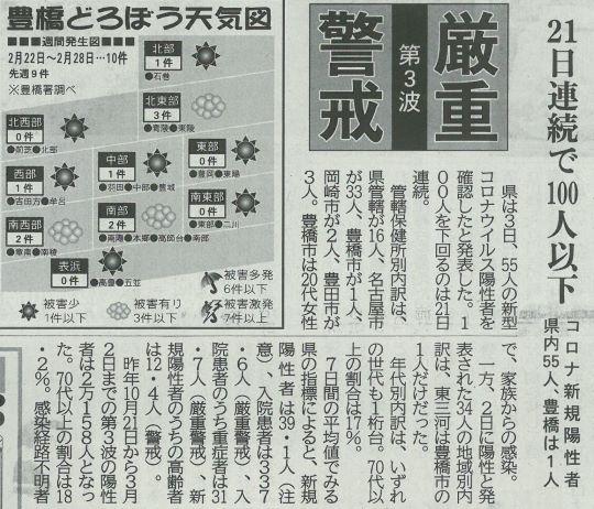 愛知県では 投稿日時 : 2021/03/18 主担 カテゴリ:今日の出来事 (令和3年3月18日 東愛知新聞より) 昨日の新型コロナ新規陽性者数は、愛知県48人、豊橋は0人でした。東京など関東でも、緊急事態宣言が21日に解除される見通しとなってきました。しかし、全国では1日の新規陽性者数が1500人を超え、第4波の到来とも言われています。 {{options.likeCount}} {{options.likeCount}}