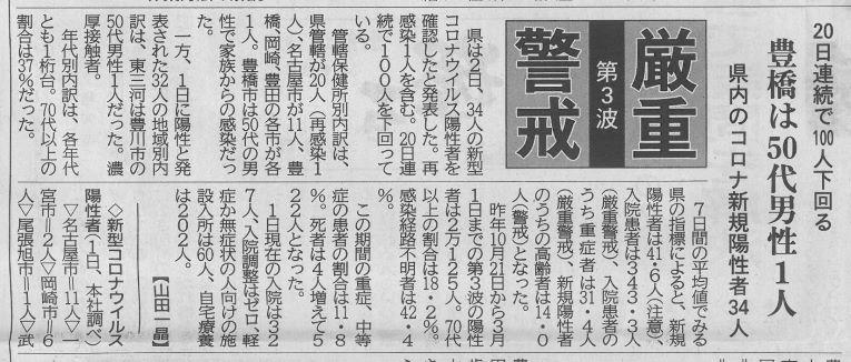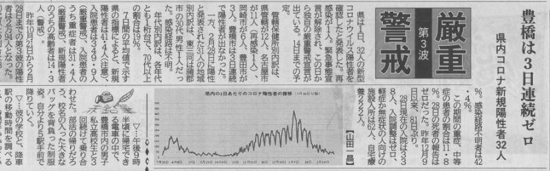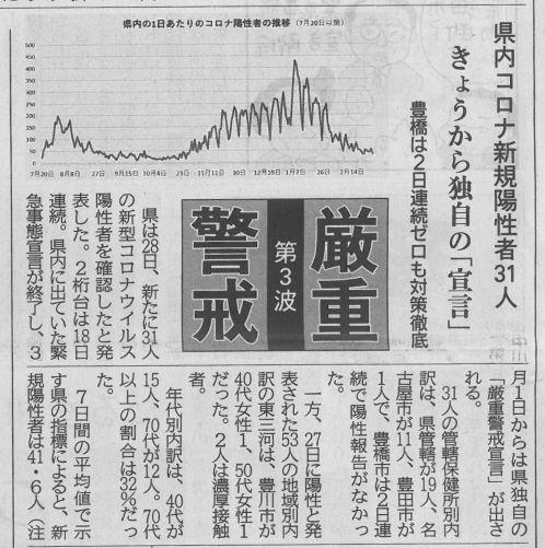 愛知県の厳重警戒宣言 投稿日時 : 2021/03/11 主担 カテゴリ:今日の出来事 (令和3年3月11日 東愛知新聞より) 昨日の新型コロナ新規陽性者数は、愛知県44人、豊橋1人でした。愛知県は県独自の厳重警戒宣言を1週間延長させました。 {{options.likeCount}} {{options.likeCount}}