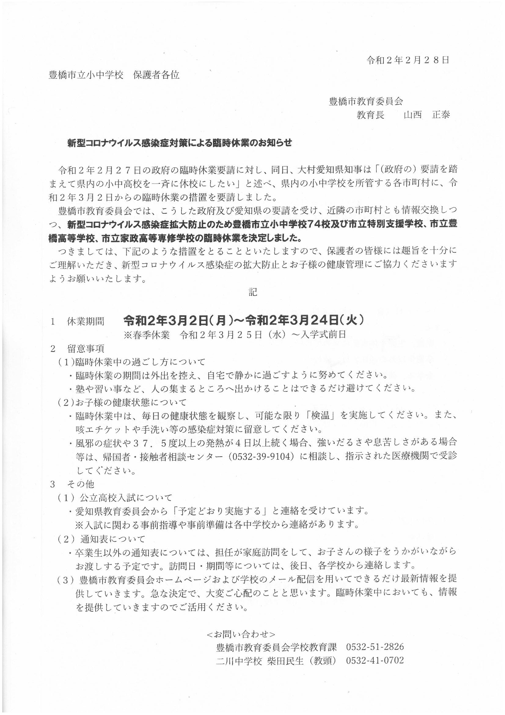 昨日夕方の急な政府の臨時休業の要請を受けて、豊橋市教育委員会から次のような決定が下されました。卒業式についても、昨日までの連絡や計画と異なり、卒業生と教職員でのみ短縮して行うこと。お子様の健康に気をつけていただくことなどが記されています。卒業生にとっては保護者の方に見守られることができず、保護者の方につきましてはお子様の晴れ姿を見ることができず残念だとは思いますが、ご理解のほどをよろしくお願いします。