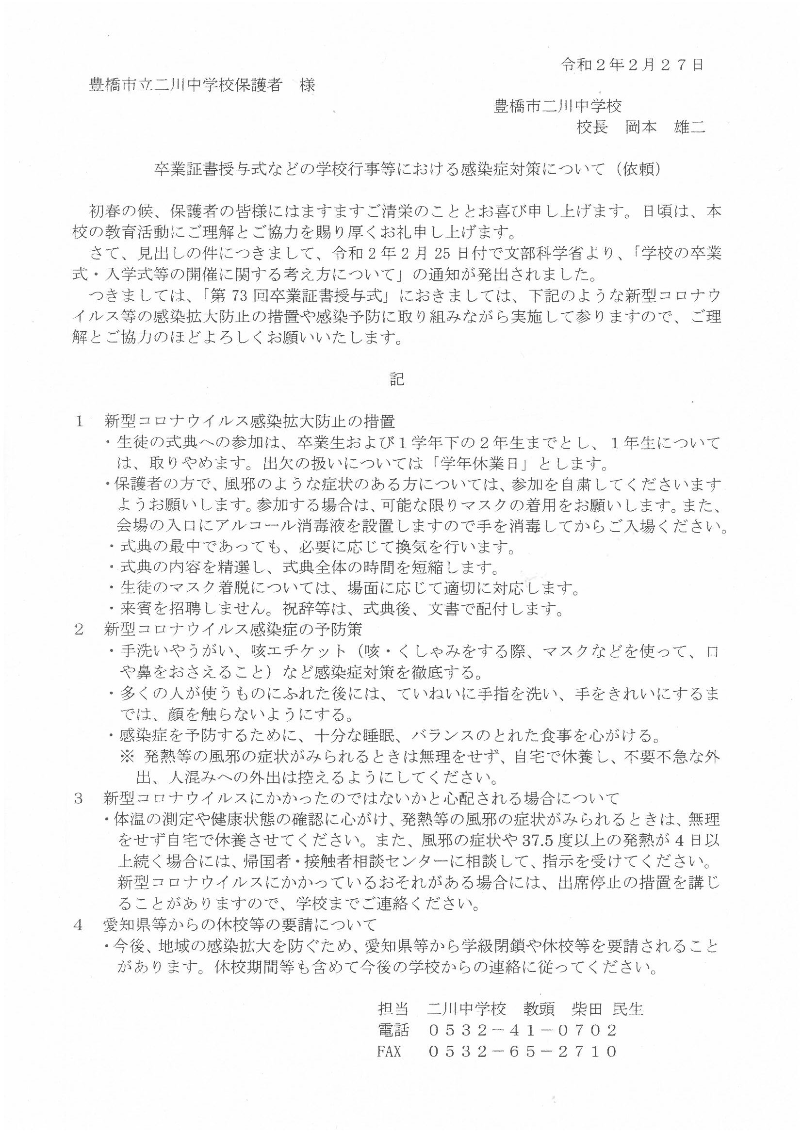 卒業証書授与式などの学校行事等における感染症対策について 投稿日時 : 2020/02/27 主担 カテゴリ:今日の出来事 SKM_C454e20022720320.jpg 本日帰り、生徒に上記の重要な手紙を渡しましたので、必ずご確認ください。 0 {{options.likeCount}} {{options.likeCount}}