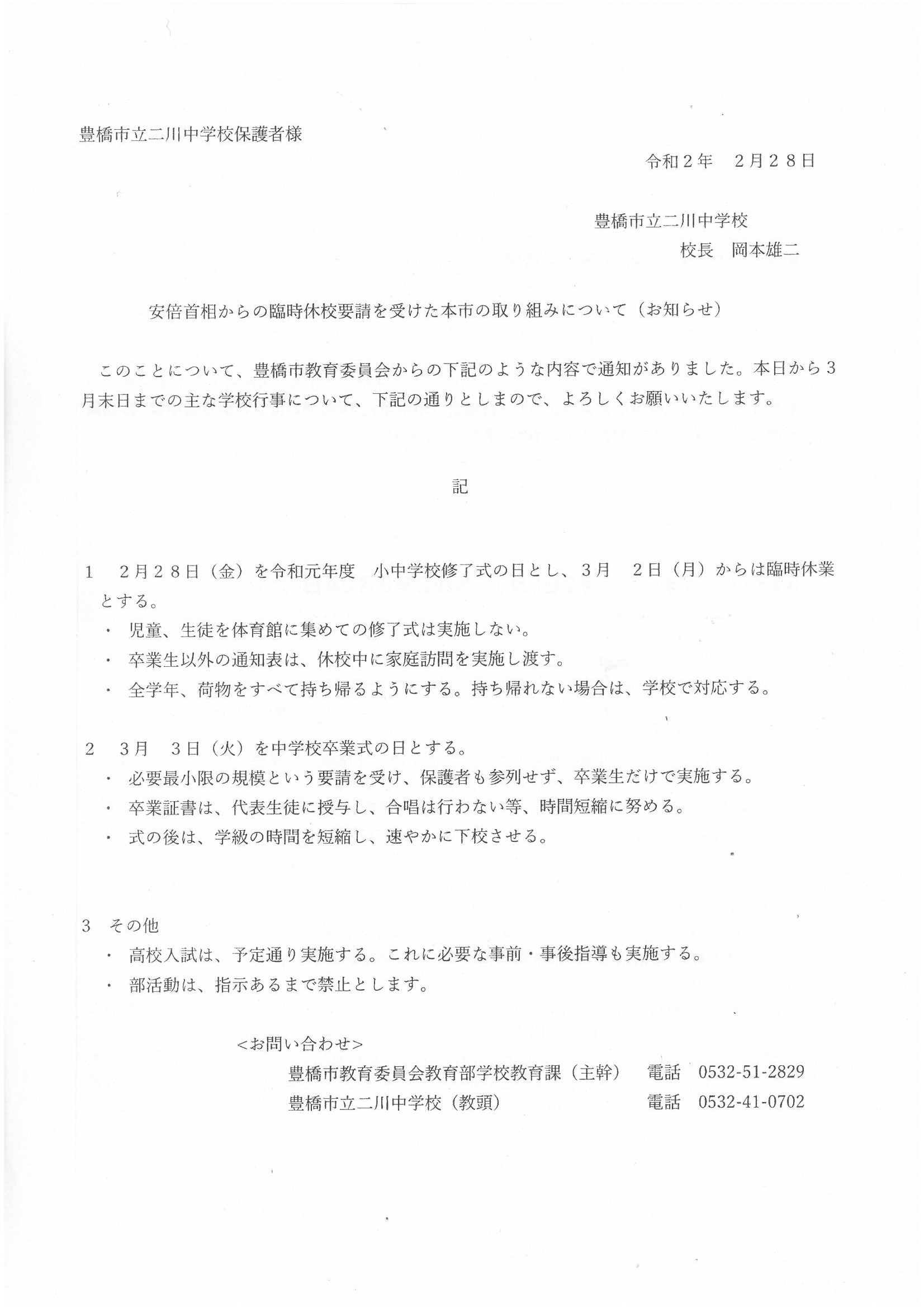 新型ウイルス感染症対策による臨時休業のお知らせ 投稿日時 : 2020/02/28 主担 カテゴリ:今日の出来事 SKM_C454e20022813530.jpgSKM_C454e20022813520_0002.jpgSKM_C454e20022813520_0001.jpg 昨日夕方の急な政府の臨時休業の要請を受けて、豊橋市教育委員会から次のような決定が下されました。卒業式についても、昨日までの連絡や計画と異なり、卒業生と教職員でのみ短縮して行うこと。お子様の健康に気をつけていただくことなどが記されています。卒業生にとっては保護者の方に見守られることができず、保護者の方につきましてはお子様の晴れ姿を見ることができず残念だとは思いますが、ご理解のほどをよろしくお願いします。 0 {{options.likeCount}} {{options.likeCount}}