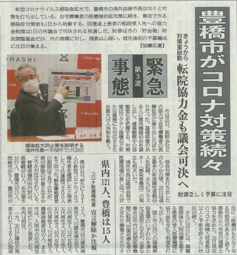 豊橋第3波ようやく静まる 投稿日時 : 2021/02/13 主担 カテゴリ:今日の出来事 (令和3年2月13日 東愛知新聞より) 1月の緊急事態宣言が出てから1か月が経ちますが、ようやく新規陽性者数が減少傾向となっています。しかし、愛知県を含む10の都府県は緊急事態宣下の延長がされています。早く解除できるように努めることと、解除後も感染爆発させない取り組みが必要です。 {{options.likeCount}} {{options.likeCount}}