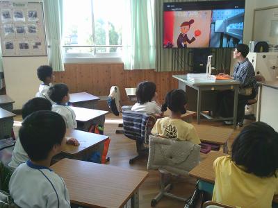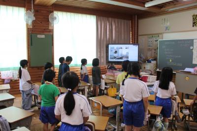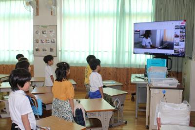 1年生の教室では、テレビに映る歌詞をみながら元気いっぱいに歌う様子が見られました。