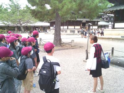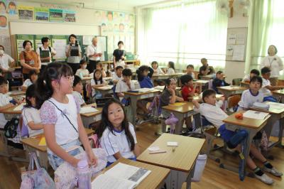 中国では、昼食はビュッフェスタイルであり、清掃もないことから、日本の給食と清掃が見たいとのことで、最後に見学をされました。そして、見学後、昼放課の全校児童と代表児童が国旗をもって、お別れをしました。