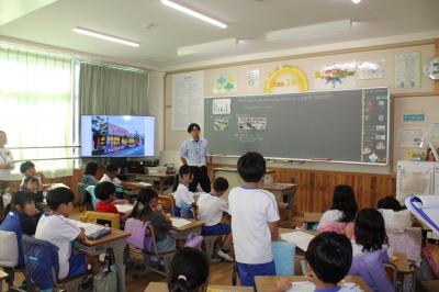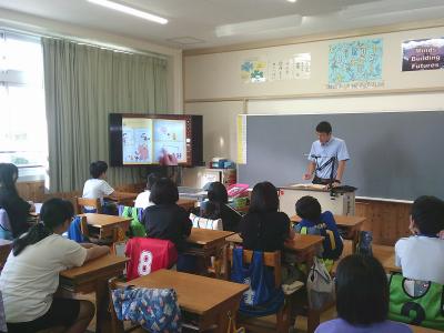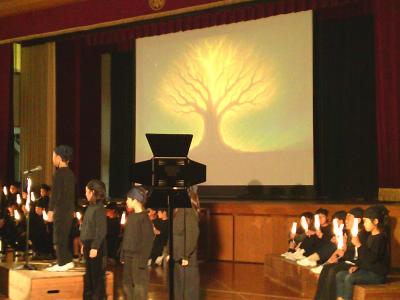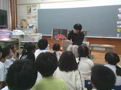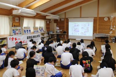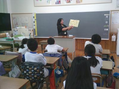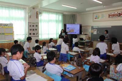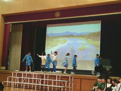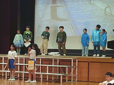 高学年向けの命の講演会は、講師に朝倉三恵氏をお招きして『小さな命のメッセージ』をテーマにお話をいただきました。「生まれて、生活できていること、学校に行けることはすばらしいこと。自分や周りの人の命を大切にしましょう」など、大変すばらしい講演会となりました。「人権の種はまきました。あとはみなさんで育ててください」とこの1年間の人権について学ぶスタートにふさわしい会になりました。また、低学年は、人権紙芝居です。『白い魚とサメの子』のお話を大画面を使って、演じていただきました。紙芝居鑑賞のあと、感想の交流の授業も行っていただきました。