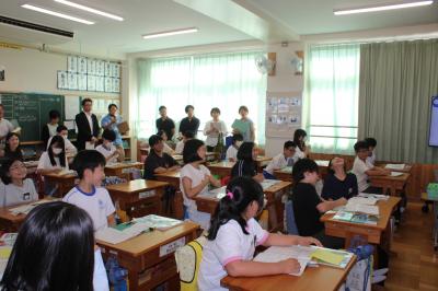 Since school lunches in China are typically served buffet-style and schools do not include cleaning duties, our guests were especially interested in observing Japan's school lunch system and student-led cleaning. After the observation, all Hatcho students and selected representatives gathered during lunch recess to see off the Nantong students, waving national flags in farewell.