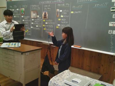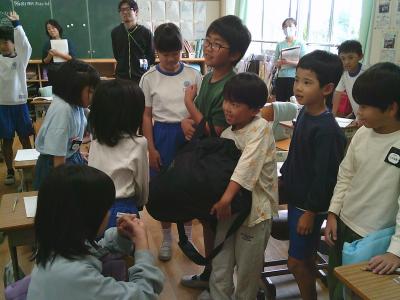 洋服、付箋紙、冬瓜、百科事典、小さいバック、大きなバックなどを何を使用して計ったらよいかを理由とともに発言していました。子どもたちはとても意欲的に実際に試したりしながら、発言したくてしょうがない気持ちが前面にでるなど積極的に取り組むことができました。