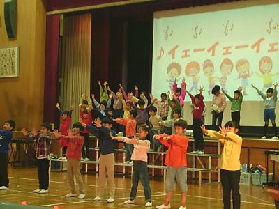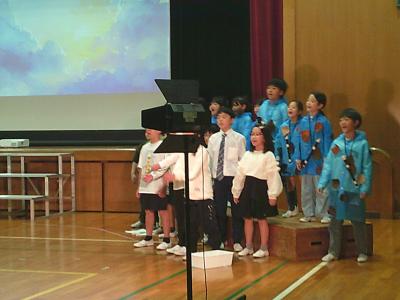 児童会執行部挨拶、全校児童で今月の歌の合唱、校長のはなし、係からの連絡といった内容です。