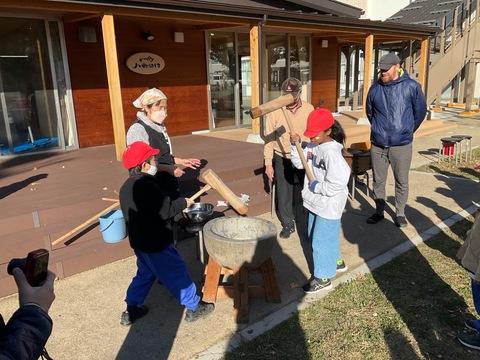 1年生のもちつきでは、もち米を蒸し器で蒸すところから始まり、本格的なもちづくりでした。1年生は、もちつき体験を全員で行い、「よいしょー」と掛け声をかけるなど、元気いっぱいでした。つきたてのお餅にきな粉をまぶして、きな粉もちとしていただきました。