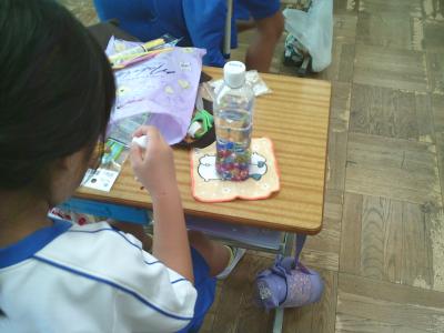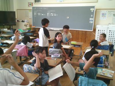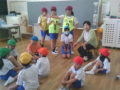 来てくだっさったお年寄りは21名。たてわり班(1年から6年の異学年グループ)に分かれて、自己紹介ゲーム、ジェスチャーゲーム、紙飛行機とばしなど、6年生が考えた遊びで一緒に楽しみました。