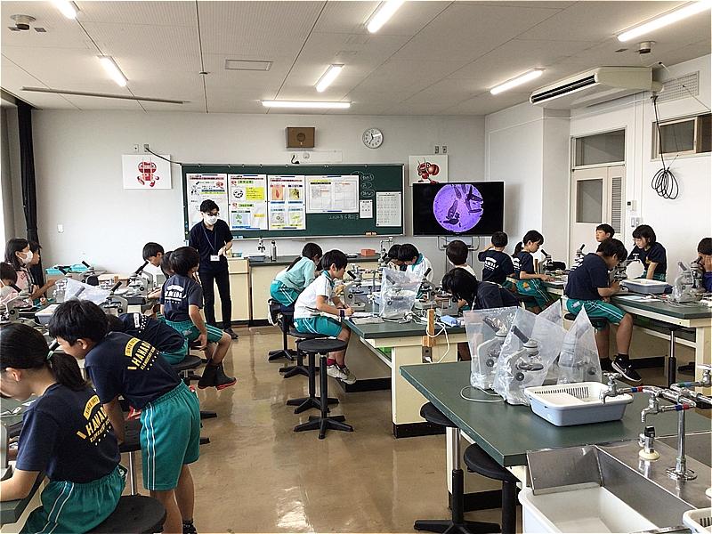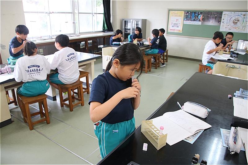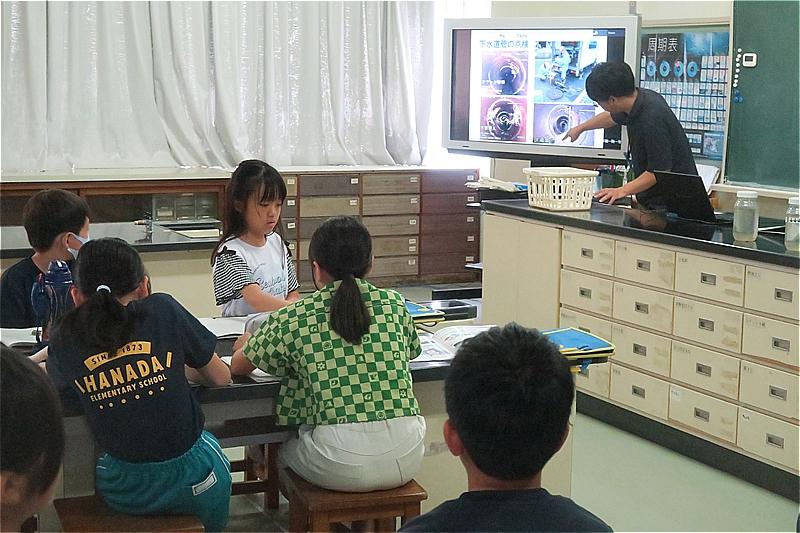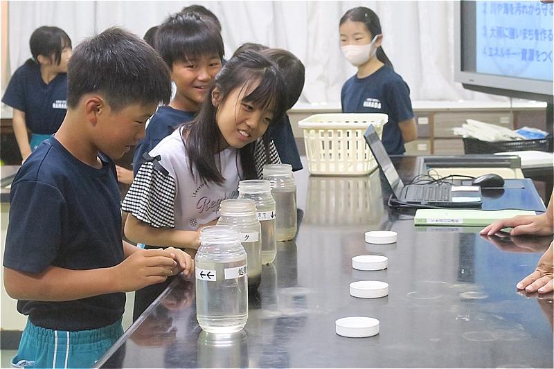 7月16日(火) 4年生が出前講座「下水道教室」で、汚れた水を処理する仕組みを学習しました。講師は豊橋上下水道局の職員の方です。下水を処理するための微生物を顕微鏡で観察したり、処理を重ねていくと汚水がどのようにきれいになっていくのかを実際に見たり、においを嗅いだりし、その効果を実感しました。これで上水道と下水道の学習は一区切りとなります。学習を通して、毎日使う水道に対する見方・考え方を深めることができました。