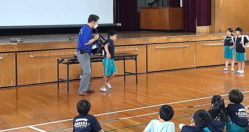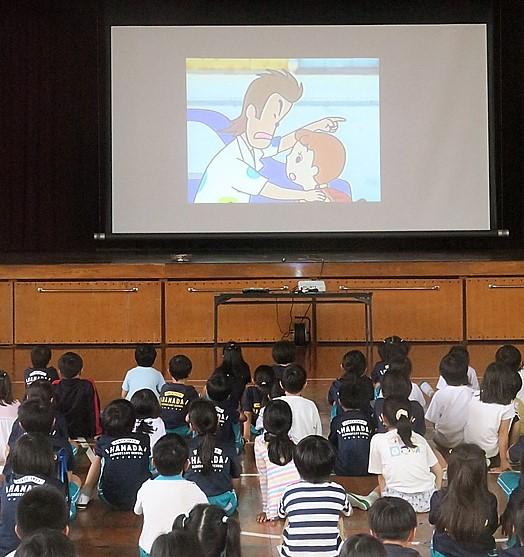7月1日(月)市の安全生活課の方を講師に招き、1・2年生を対象に防犯教室(不審者)を行いました。不審者がどんな言葉で声をかけ、子どもをだまそうとするのか、その時どうすればよいかなどを動画を視聴したり、講師のお話を聴いたりして学びました。また、「ついていかない」「みんなといつもいっしょ」「きちんと知らせる」「おおごえで助けを呼ぶ」「にげる」の「つみきおに」の大切さを教えてもらったり、もしランドセルをつかまれてしまったらどうするとよいかを教えてもらったりしました。最後は助けを求める練習です。どの子も力いっぱいの大声を出していました。