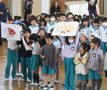 1年生の入場後は、各学年の出し物です。▼2年生のテーマは「給食」。10秒でエプロンや三角巾を身に付けたり、配膳室でのあいさつの仕方のお手本を見せてくれました。明日からさっそくまねしてくださいね。