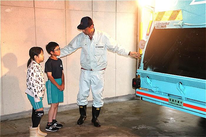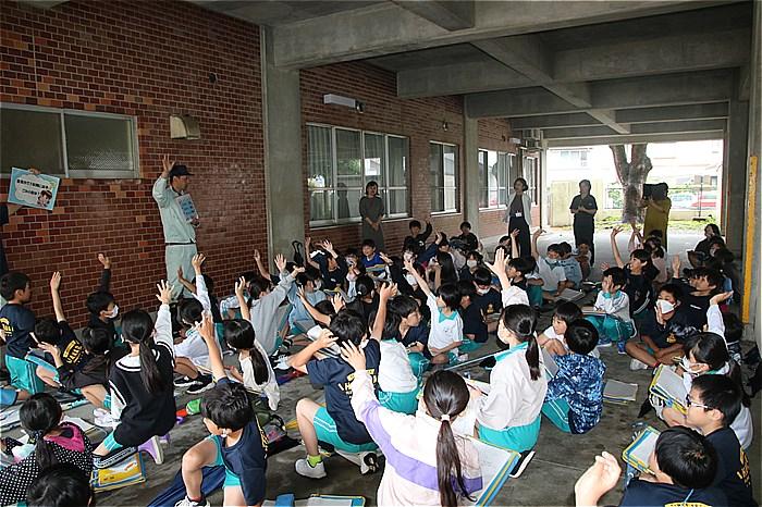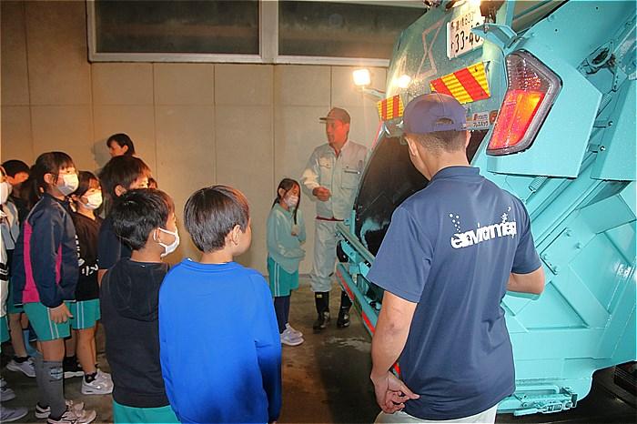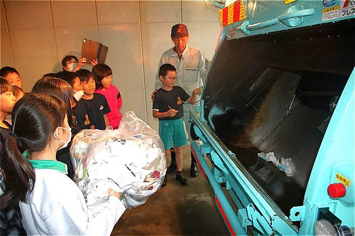 5月7日(火)4年生が、豊橋市のごみの収集方法や最終処分場の問題などについて、出前講座で学習しました。雨天でしたので、市民館のピロティで行いました。豊橋市の1日のごみの量やごみの種類、ごみの分別の大切さなどを、市の環境センターの方のクイズに答えながら楽しく学びました。その後は、ごみ収集車に代表児童がごみを投入したり、安全装置の仕組みを体験したりしながら、車の仕組みを学びました。子どもたちからは「一日にこんなにごみが出るのか」「僕たちが大人になる頃には最終処分場がいっぱいになってしまう」などの声が聞かれ、ごみ問題について関心を高めました。社会科の学習でさらに学習を深めていってください。