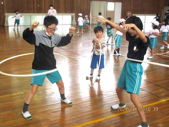 校舎改築工事により運動場が狭いために、休み時間に遊べる場所(運動場と体育館)を各学年に割り当てて、ローテーションしています。学年の割り当ては、ペア学年にしています。写真は、5月15日(水)の体育館の様子です。6年生が1年生にフラフープの技を紹介したり、一緒に遊んだり、進んで片付けに取り組んだりするなど、頼もしい姿がたくさん見られます。6年生の皆さん、これからもよろしくお願いします。
