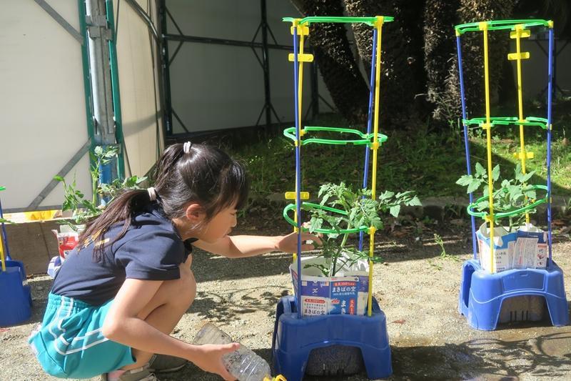 5月29日(水) 中庭は朝から、とてもにぎやかでした。1・2年生は、昨日の大雨・強風に備えて、避難させていたアサガオ・ミニトマトを運び、元の場所に戻していました。そのあとは水やり・観察です。通りがかると「実ができてきたよ。見て見て」と、多くの子から声をかけてもらいました。確かにたくさんなっていました。その後、2年生はさつまいもの「つるさし」です。今年は、用務員さんが中庭に作ってくれた畑で栽培します。毎日観察できるので、これからが楽しみですね。たんぽぽの子たちは、ナスの植え付けです。協力して作業できました。