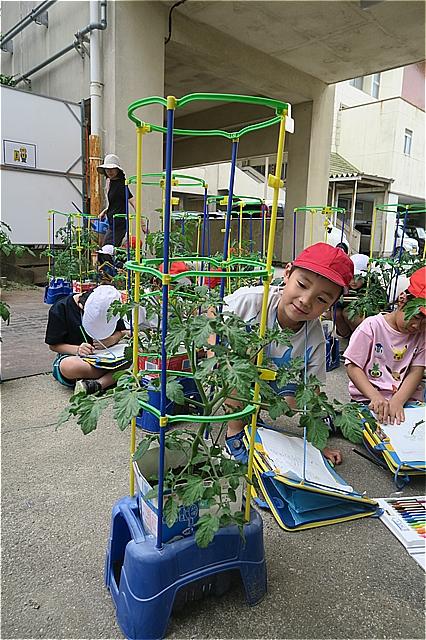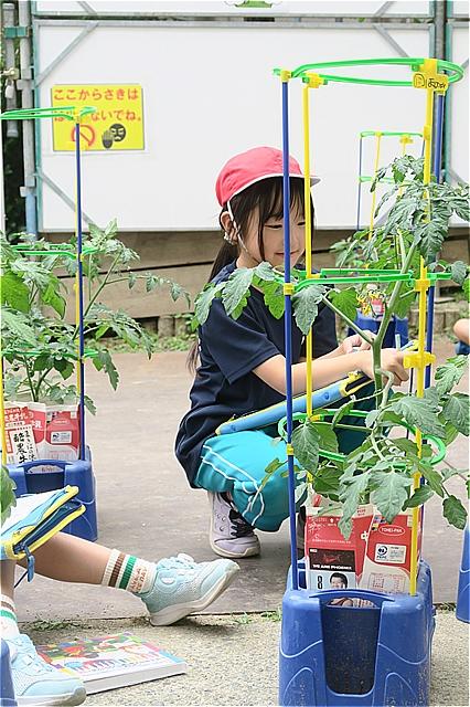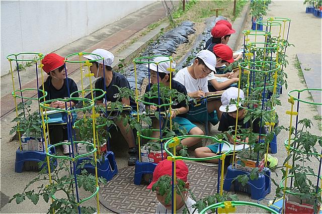 6月7日(金) 2年生が、熱心に観察日記を書いていました。「見て見て、ミニトマトがさいたよ」と言われ、「咲いた?」と思いながら指の先を見ると、大きくなったミニトマトでした。子どもらしい素敵な表現だなと感じました。観察日記をのぞくと「ガーデンガーデン」「花子ちゃん」「わんわん」「ミニトマトボーイ」・・・と書かれていました。聞いてみると、育てているミニトマトの名前だと分かりました。楽しそうです。ミニトマトが随分成長してきました。そろそろ収穫できそうです。