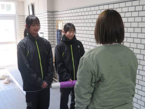 作成した掲示物を,各クラスの代表生徒「お届け隊」が3つの小学校にわかれて届けに行き,6年の担任の先生に手渡しました。