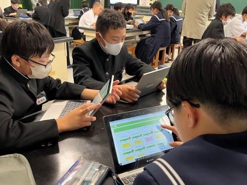 委員長からの提案やそれに対する意見は,生徒がその場で入力し,スクリーンに打ち出されました。