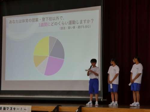 初めに保健委員会による劇と全校に対して行ったアンケートの結果を発表しました。「自分の言いたいことが言えずモヤモヤした気持ちになる」と答えた生徒が約60%など,まわりの人とのコミュニケーションのとり方の難しさが明らかになりました。
