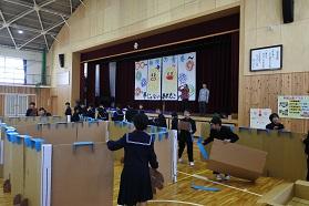 ・体育館を使って行います。下駄箱から入り、健康観察、手洗い後、体育館に移動してください。(生徒同士の間隔を広く取り行います)