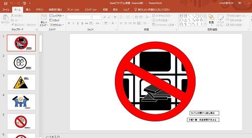 居心地のよい北部中を目ざして、校内に必要なピクトグラムの制作を行いました。ピクトグラムをデザインをするなかで、伝わりやすさのポイントを見つけ出したり、アイデアの見直しを図ることができました。また、PowerPointの活用によって容易に描画や着色、修正ができています。生徒の感性が光るピクトグラムを校内で探してみてください。