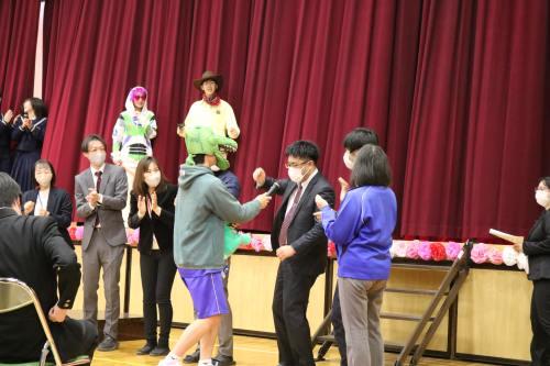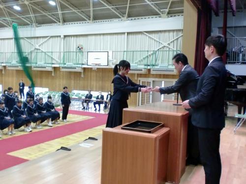 この後,リバーサイドボランティアにこの1年間,継続的に取り組んだ生徒30名に,下地校区から特別表彰がありました。